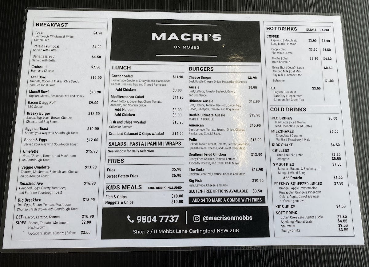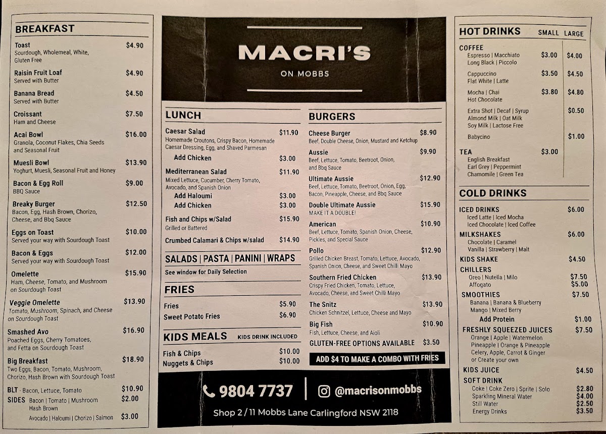 The menu at Macri's on Mobbs features a variety of options suitable for breakfast, light meals, and coffee breaks. It is organized into several groups to help visitors navigate their choices easily.